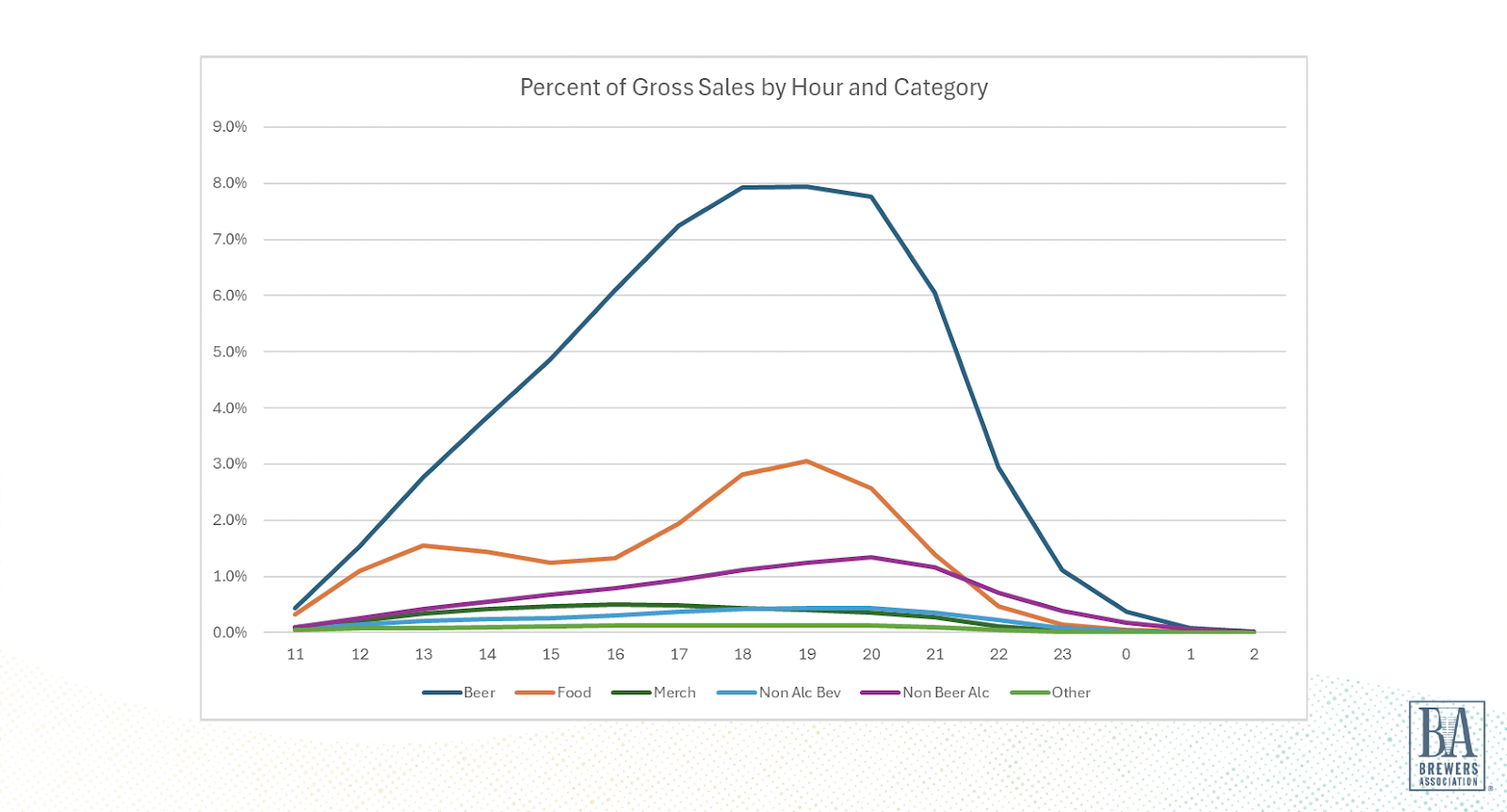 Let’s break it down by the clock. Sales patterns show that different products peak at different times. Non-beer alcoholic beverages peak later in the day, while food sales hit their stride around midday and again in the evening. Knowing these trends can help breweries optimize staffing and promotions to match peak times and drive additional business.