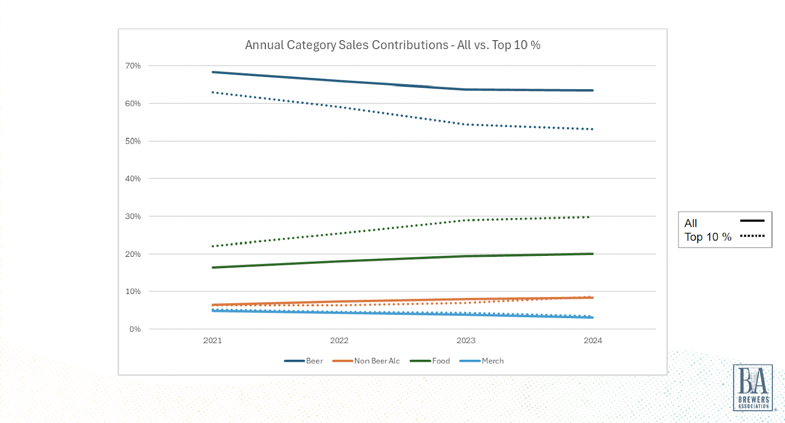 On the other hand, non-beer alcohol sales (think wine, spirits, and seltzers) are creeping up slowly, while merchandise sales are slipping. The top 10% of locations, those high-flyers, are seeing even more success with food. They’ve figured out that a mouth-watering menu can really boost their bottom line, and bring more customers through the door.